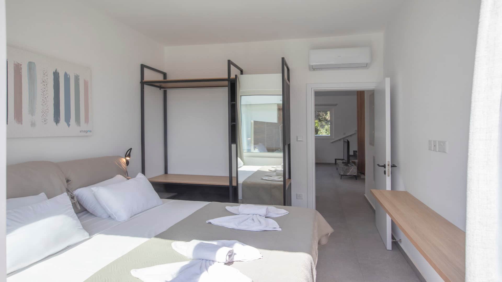 As you enter the villa, you will find the spacious, and very modern open-plan living room, kitchen and dining area, with large patio doors leading to the garden and pool. The living room features a comfortable corner sofa, widescreen Smart TV with satellite channels and wi-fi connection. The dining area has a table and chairs to seat 10 people and the kitchen is fully equipped with all appliances and utensils needed for an enjoyable self-catering stay.
